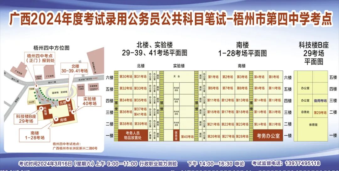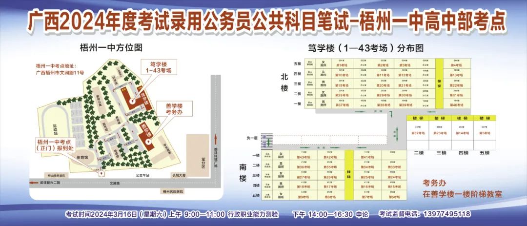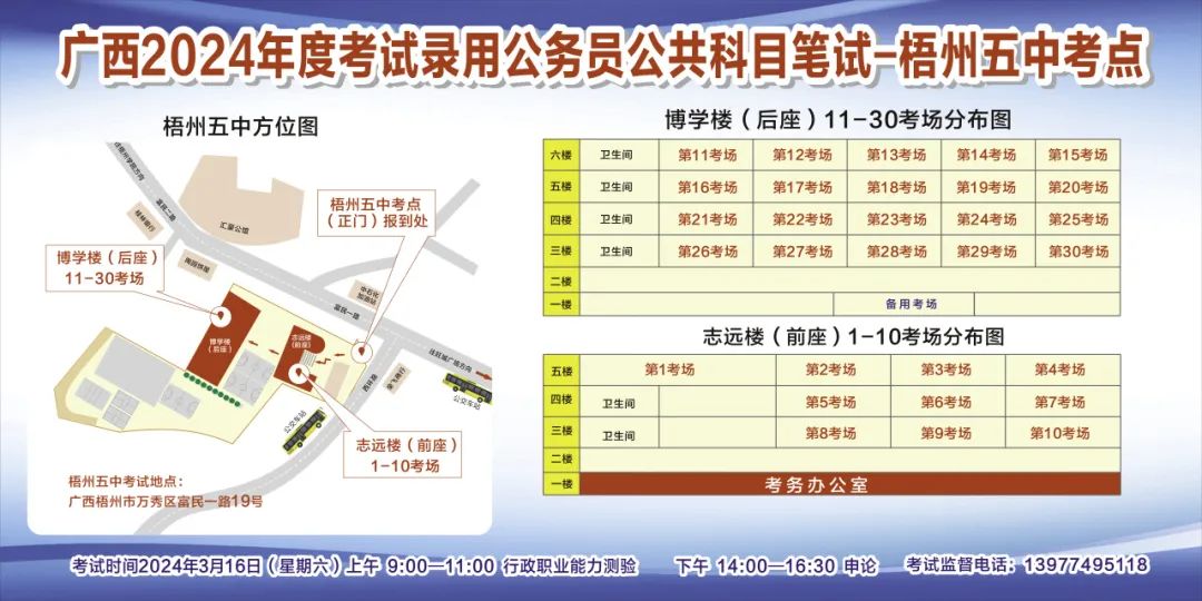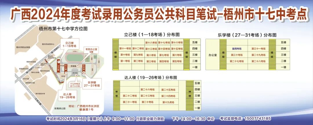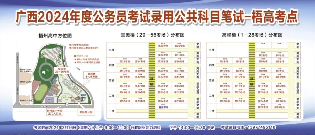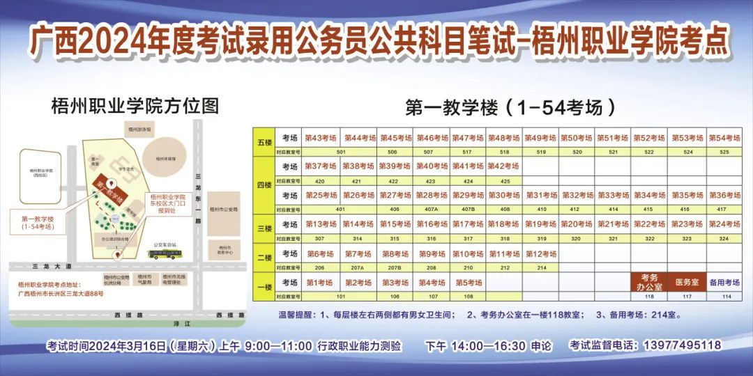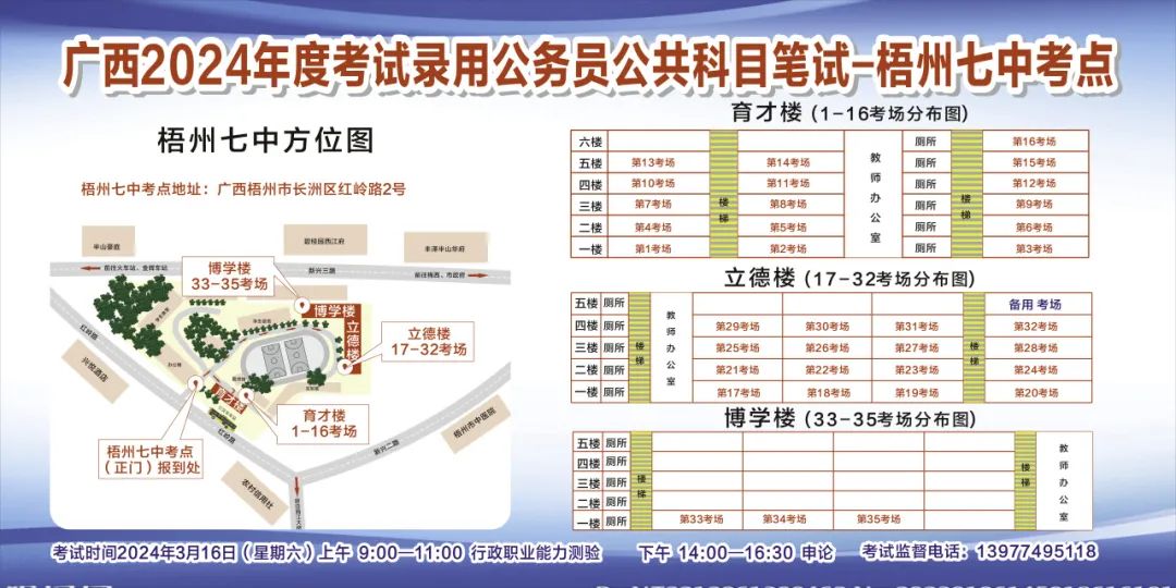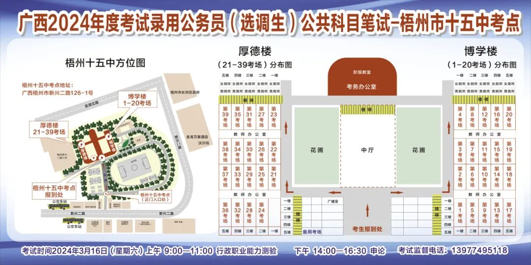 一、廣西2024年度考試錄用公務(wù)員(選調(diào)生)公共科目筆試將于3月16日舉行,梧州考區(qū)共設(shè)置9個(gè)考點(diǎn),請(qǐng)考生提前熟悉各自考點(diǎn)位置、周邊環(huán)境及交通情況,考試當(dāng)天提前出門(mén)做好準(zhǔn)備,準(zhǔn)時(shí)參加考試。特別提示:因考點(diǎn)停車(chē)場(chǎng)地有限,所有考生車(chē)輛不得進(jìn)入考點(diǎn),請(qǐng)考生規(guī)劃好前往考點(diǎn)的交通方式和路線。