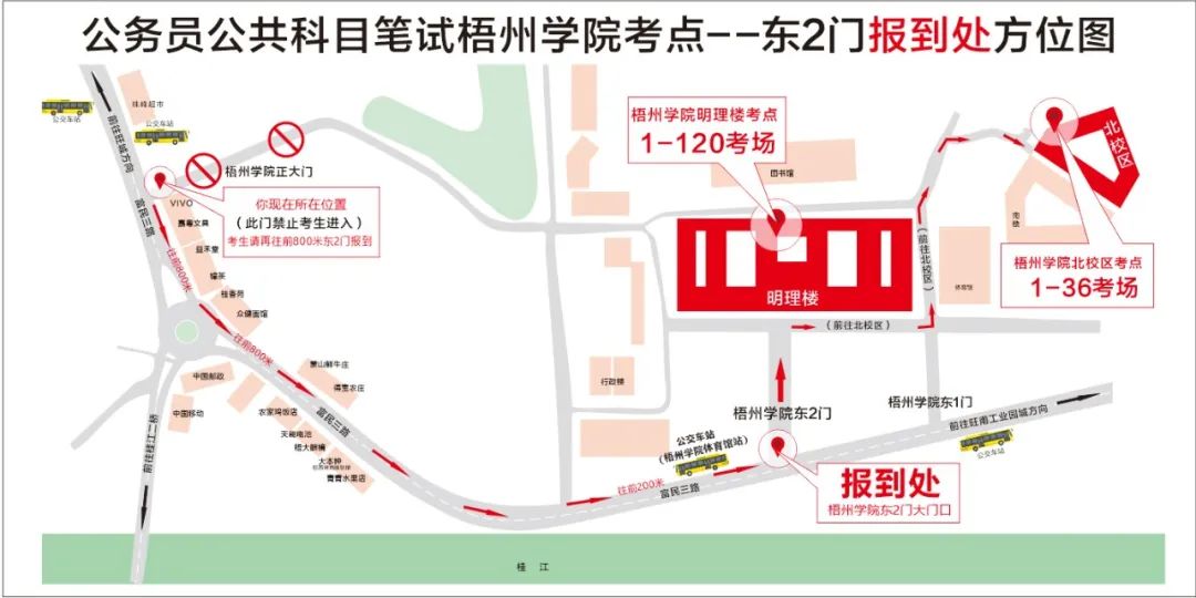 公交車(chē)參考:乘坐10路、32路、49路、49路延長(zhǎng)線、蒼梧城鄉(xiāng)6路到梧州學(xué)院體育館站,下車(chē)后步行約200米到達(dá)梧州學(xué)院東大門(mén)??忌y(tǒng)一在梧州學(xué)院東大門(mén)進(jìn)入,考點(diǎn)門(mén)口處于交通干道,送考車(chē)輛只能在東門(mén)外短暫停留,梧州學(xué)院南門(mén)及其他門(mén)無(wú)法核驗(yàn)考生身份。從東大門(mén)進(jìn)入明理教學(xué)樓考點(diǎn)考場(chǎng)步行約5分鐘,進(jìn)入北校區(qū)教學(xué)樓考點(diǎn)考場(chǎng)步行約15分鐘,請(qǐng)規(guī)劃好進(jìn)入考點(diǎn)時(shí)間。