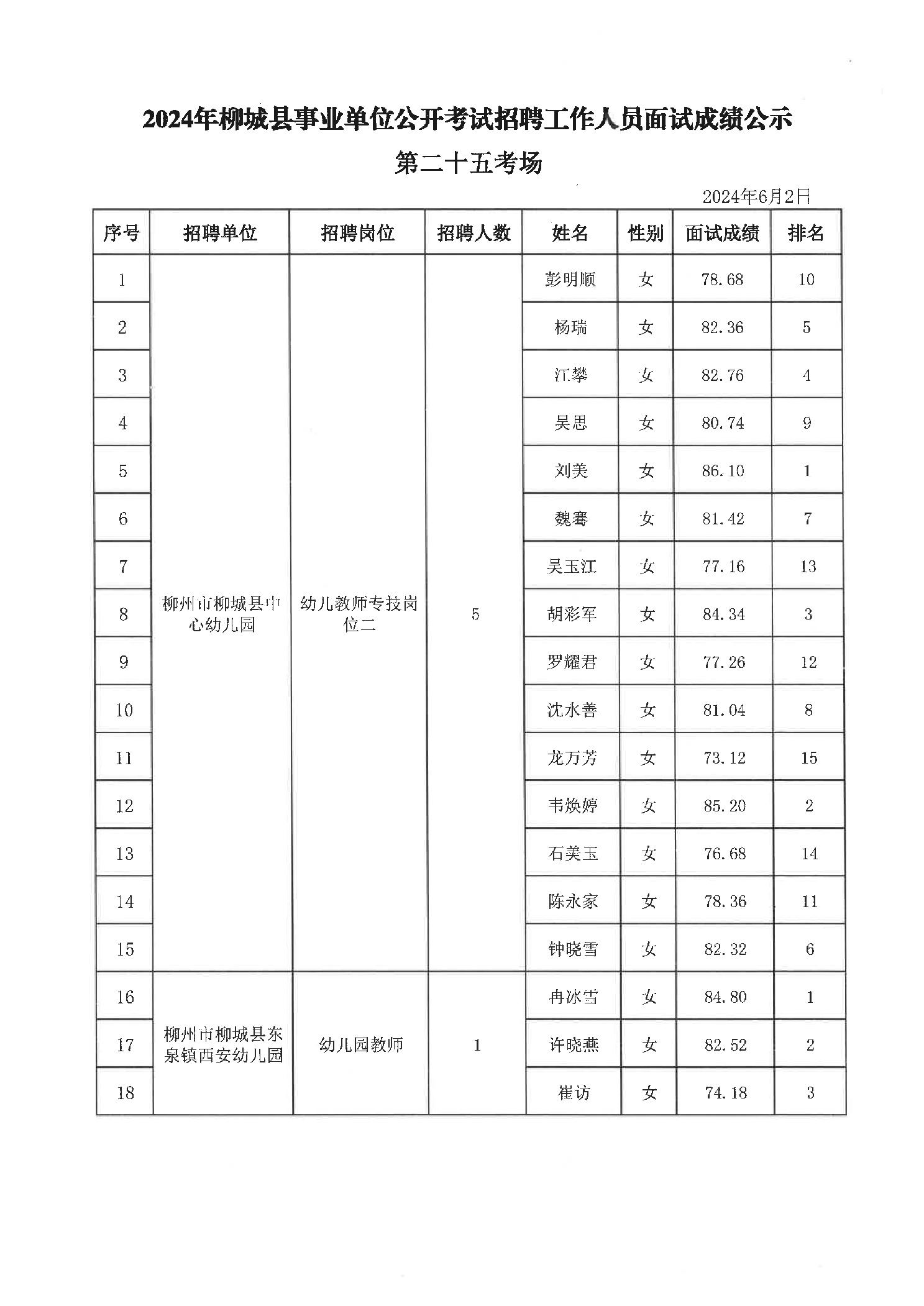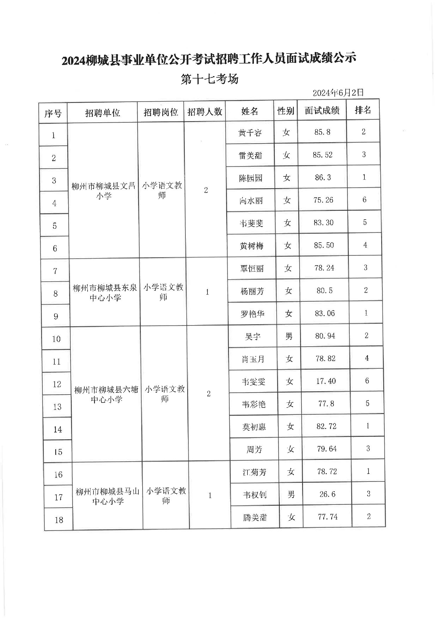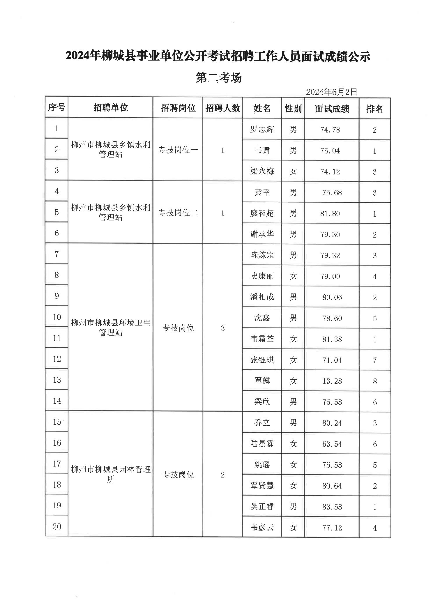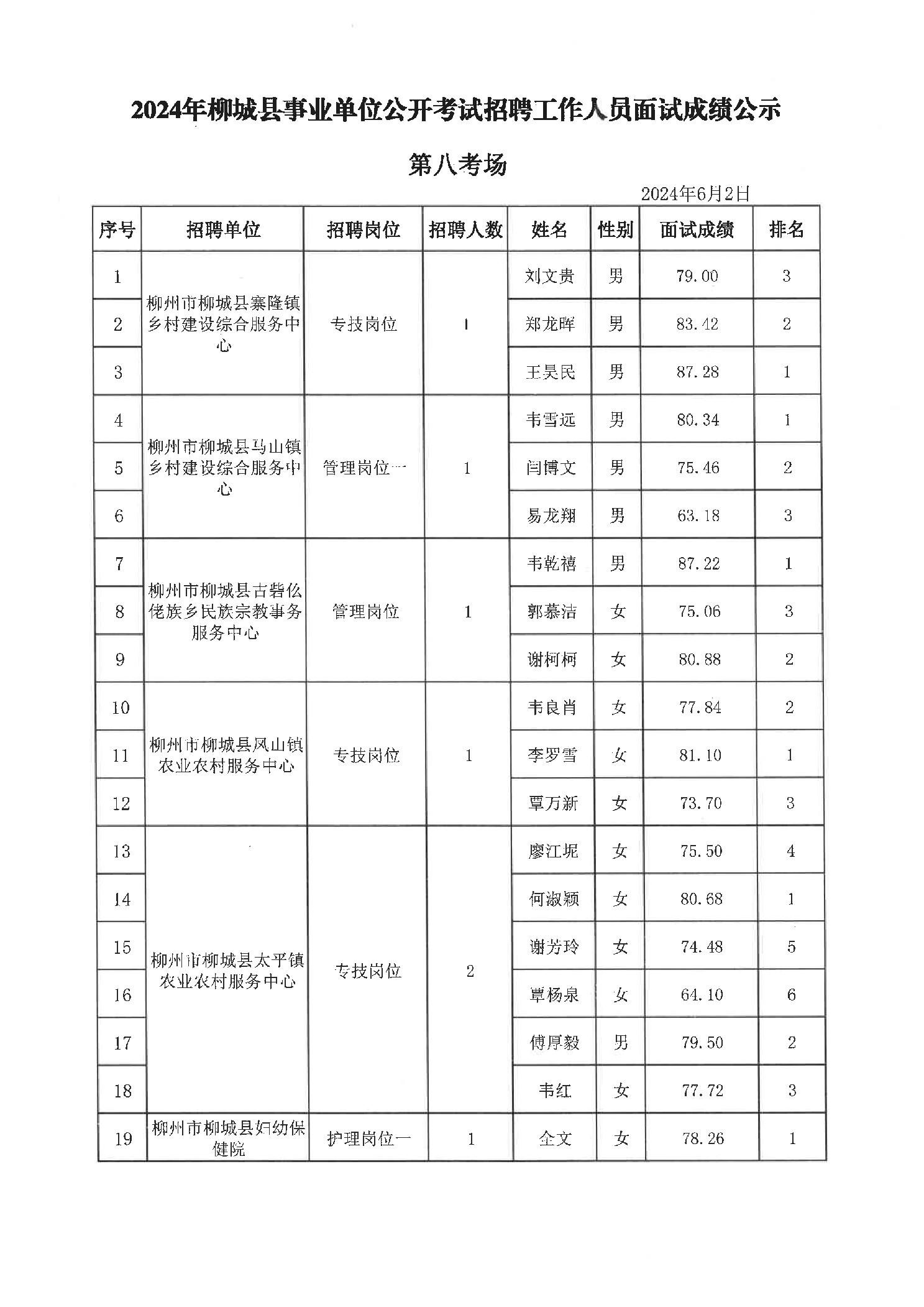 原文標題:2024年柳州市事業(yè)單位公開考試招聘工作人員面試成績公示(柳城縣崗位)