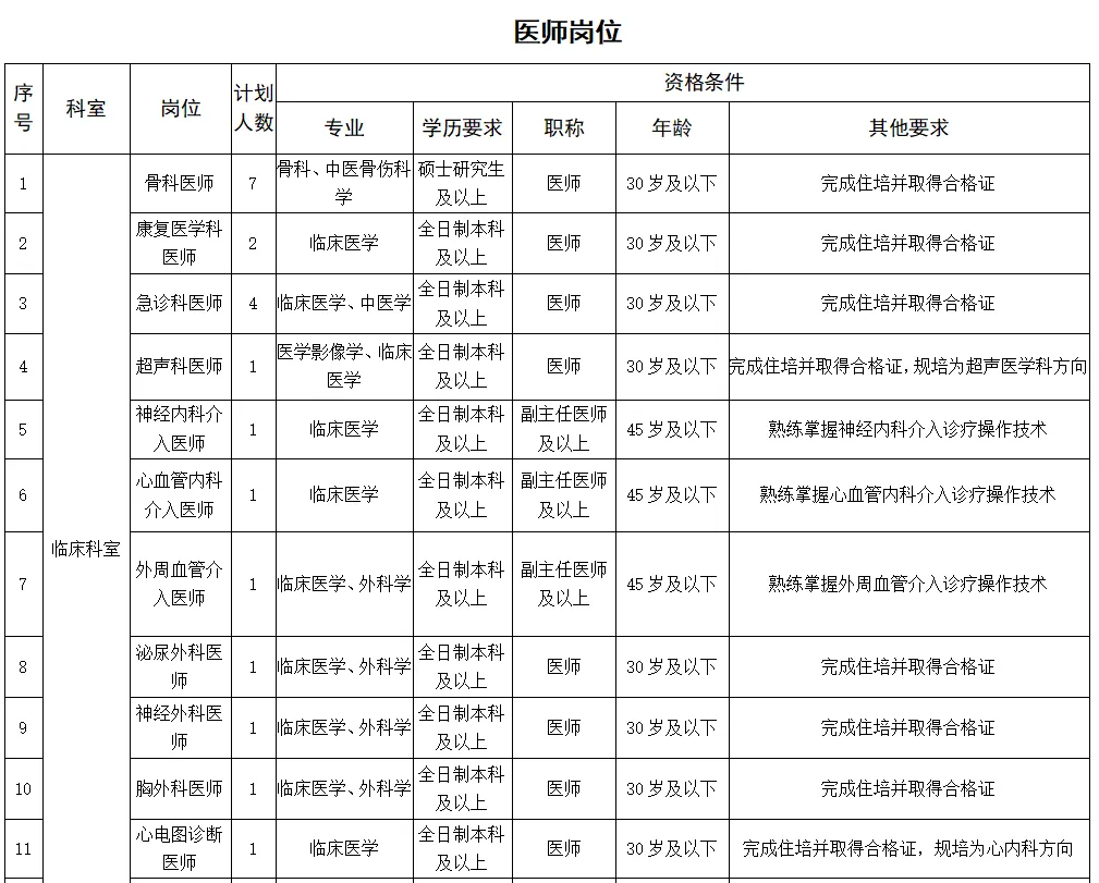 備注:醫(yī)學(xué)類(lèi)碩士研究生及以上學(xué)歷、醫(yī)學(xué)類(lèi)副高及以上職稱(chēng)者不受招聘專(zhuān)業(yè)及名額限制。