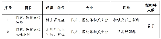 (二)臨床、醫(yī)技、護(hù)理等崗位人才(緊缺急需專(zhuān)業(yè):重癥醫(yī)學(xué)科、全科醫(yī)學(xué)科、康復(fù)醫(yī)學(xué)科、感染性疾病科、急診科、兒科、麻醉科、眼科、皮膚科、病理科、心腦電生理科等科室醫(yī)師)