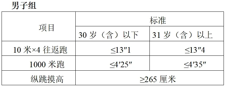 參照《關(guān)于印發(fā)公安機關(guān)錄用人民警察體能測評項目和標(biāo)準(zhǔn)(暫行)的通知》(人社部發(fā)〔2011〕48號)的項目及測試規(guī)則,結(jié)合《公安民警體育鍛煉達標(biāo)手冊》成績標(biāo)準(zhǔn),體能測評的項目和標(biāo)準(zhǔn)如下: