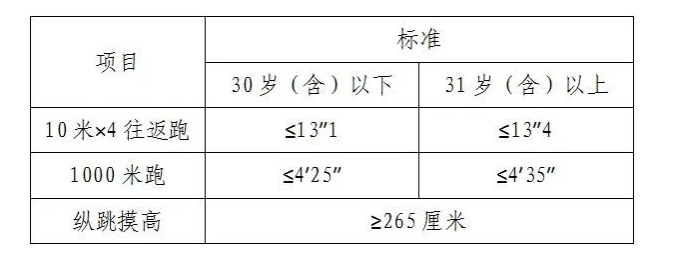 3.體能測(cè)評(píng)項(xiàng)目和標(biāo)準(zhǔn)按照《公安機(jī)關(guān)錄用人民警察體能測(cè)評(píng)項(xiàng)目和標(biāo)準(zhǔn)(暫行)》執(zhí)行。