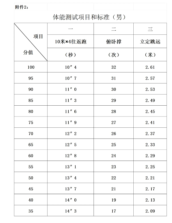 3.體能測(cè)試。參照人民警察招錄標(biāo)準(zhǔn)執(zhí)行(具體項(xiàng)目和標(biāo)準(zhǔn)詳見附件2)。測(cè)試項(xiàng)目:10米×4往返跑、立定跳遠(yuǎn)、俯臥撐,體能測(cè)試三項(xiàng)全部達(dá)標(biāo)的,方為合格。