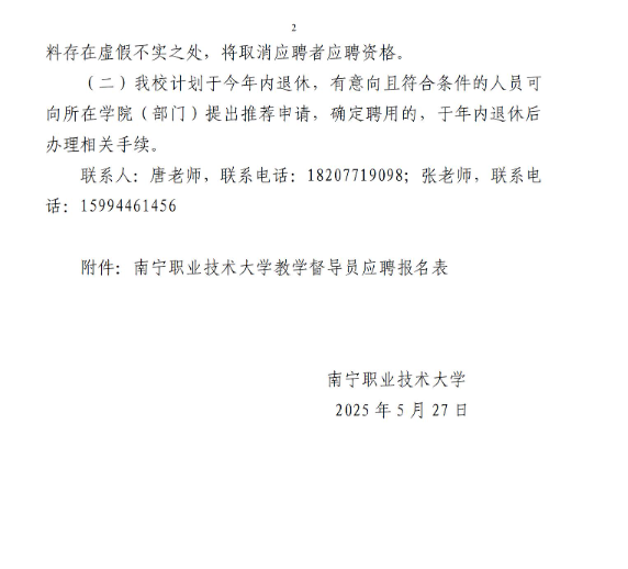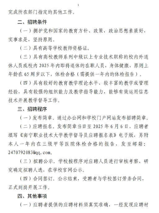 2025年廣西南寧職業(yè)技術大學招聘校級教學督導員2人