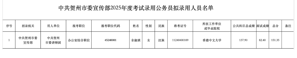 原文標(biāo)題:中共賀州市委宣傳部2025年度考試錄用公務(wù)員擬錄用人員公示