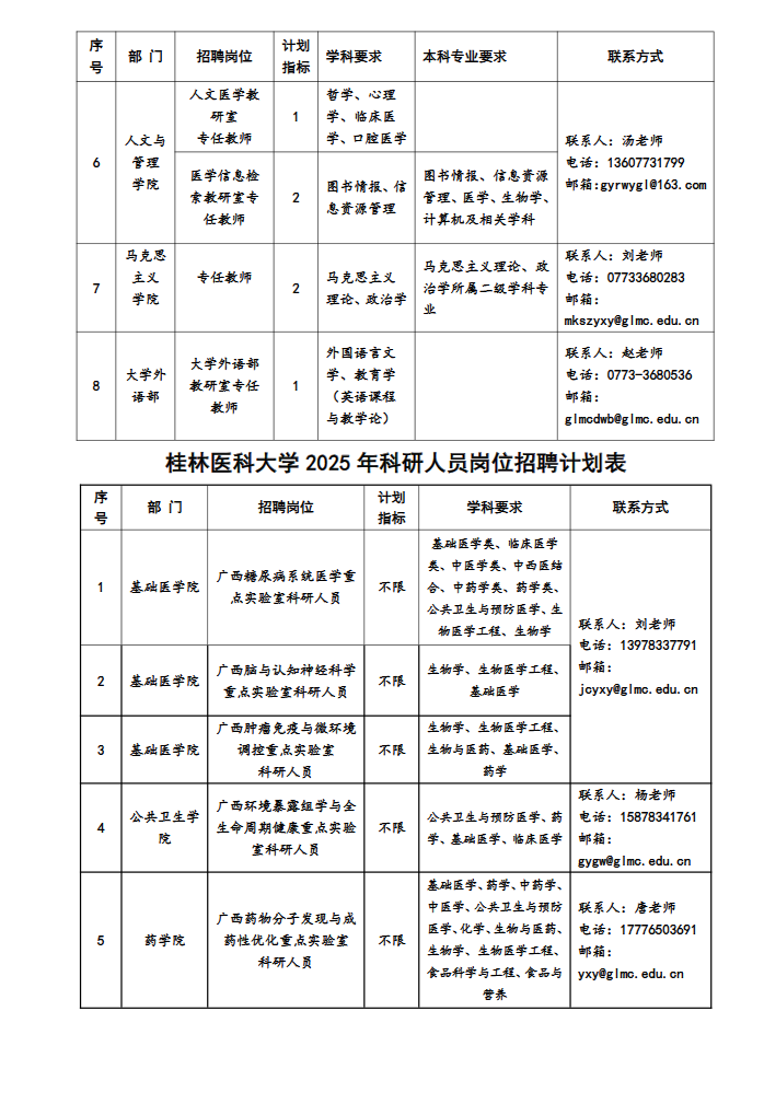 (二)各部門聯(lián)系方式見:桂林醫(yī)科大學(xué)各崗位招聘計劃表。
