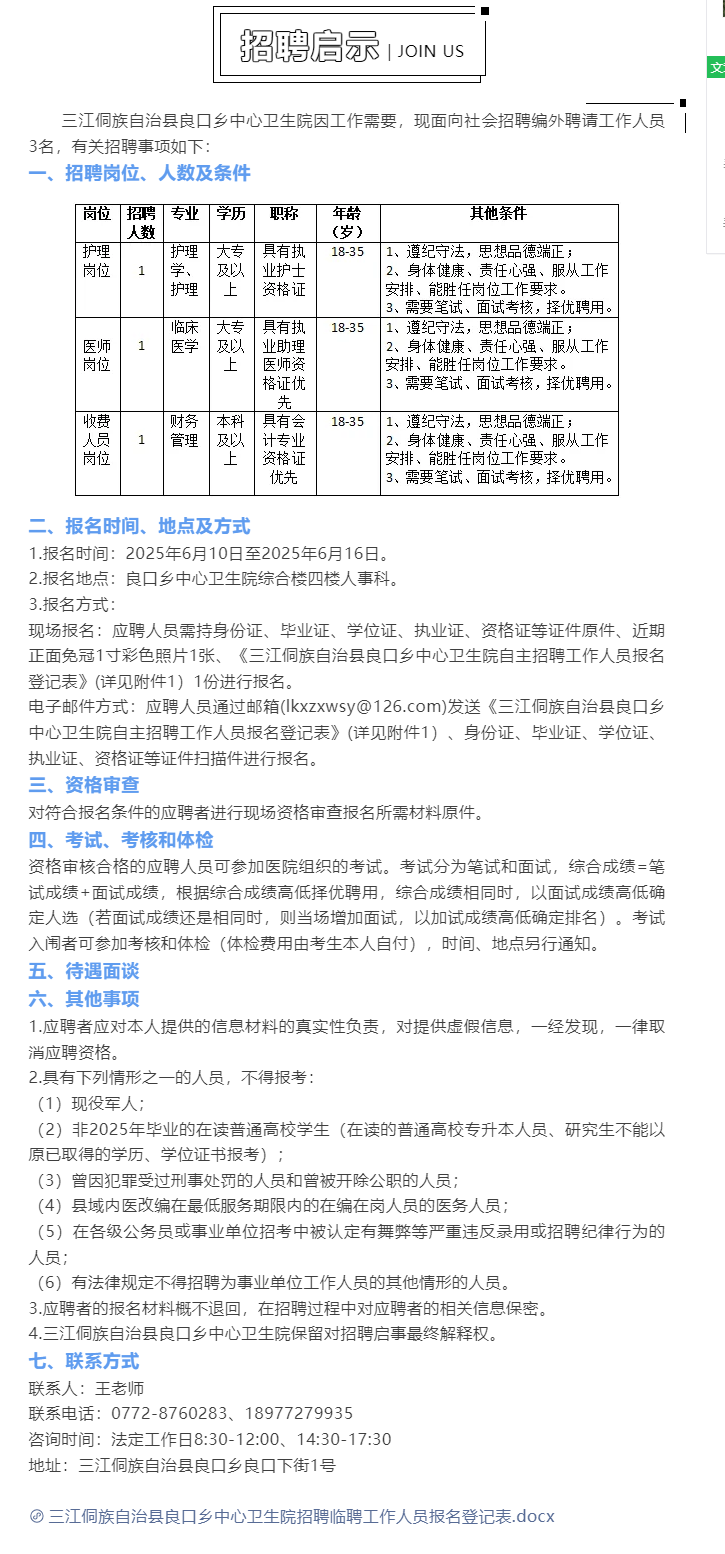 三江侗族自治縣良口鄉(xiāng)中心衛(wèi)生院招聘3人