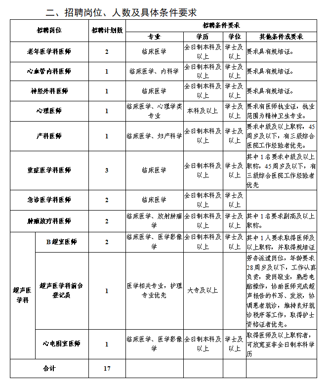 注:初中級職稱應(yīng)聘人員原則上年齡要求為35周歲及以下;如為副高以上職稱,年齡可放寬至45周歲;學歷層次高者優(yōu)先。醫(yī)師崗位中如要求具有規(guī)培證條件的是指已取得規(guī)培合格證書(含通過規(guī)培結(jié)業(yè)考試未領(lǐng)合格證書)或已取得中級及以上職稱人員。