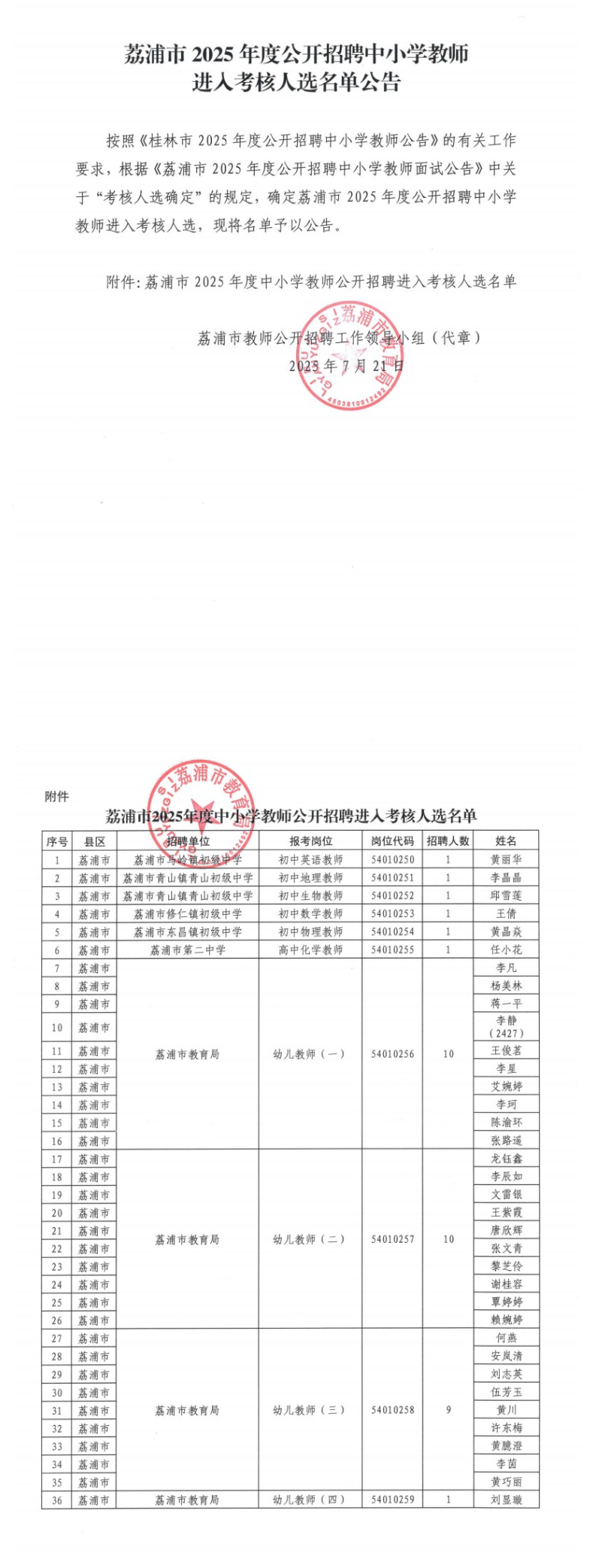 荔浦市2025年度公開招聘中小學教師進入考核人選名單公告