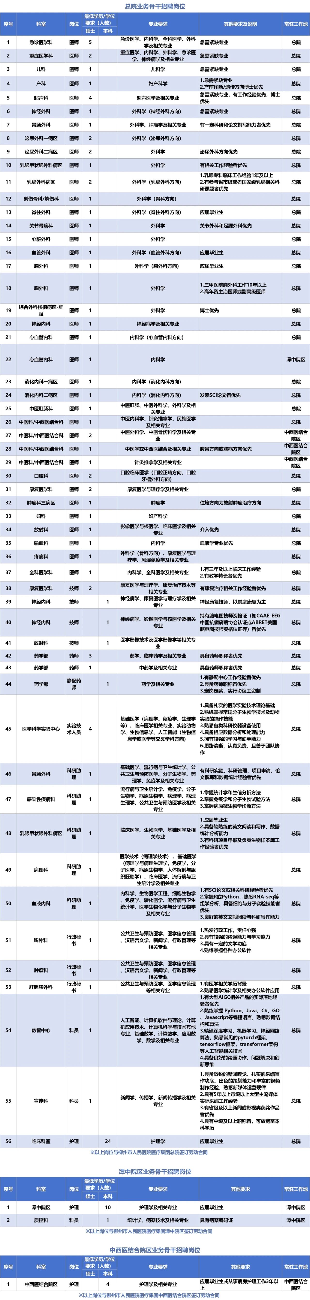 具體招聘公告詳見(jiàn)醫(yī)院官網(wǎng)(https://www.lzry.com.cn/)人員招聘欄目,具體招聘辦法由柳州市人民醫(yī)院解釋?zhuān)瘓F(tuán)院區(qū)待遇按各院區(qū)相關(guān)制度執(zhí)行,由各院區(qū)人力資源部門(mén)負(fù)責(zé)解釋。