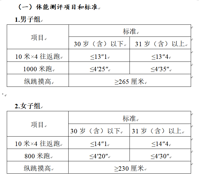測評結(jié)果分為合格和不合格。一般體能測評三項(xiàng)成績均達(dá)標(biāo)的方為合格,其中具有研究生及以上學(xué)歷報考人員,體能測評三個項(xiàng)目中有任兩項(xiàng)達(dá)標(biāo)的,即視為合格。