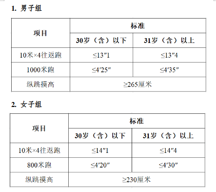 體能測評(píng)的項(xiàng)目和標(biāo)準(zhǔn)按照國家有關(guān)規(guī)定執(zhí)行,具體如下: