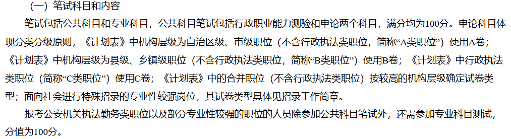 公共科目為行政職業(yè)能力測(cè)驗(yàn)(100 分)、申論(100 分)。申論分 A/B/C 卷:自治區(qū) / 市級(jí)職位(非行政執(zhí)法類)用 A 卷;縣 / 鄉(xiāng)鎮(zhèn)級(jí)職位(非行政執(zhí)法類)用 B 卷;行政執(zhí)法類職位用C卷。